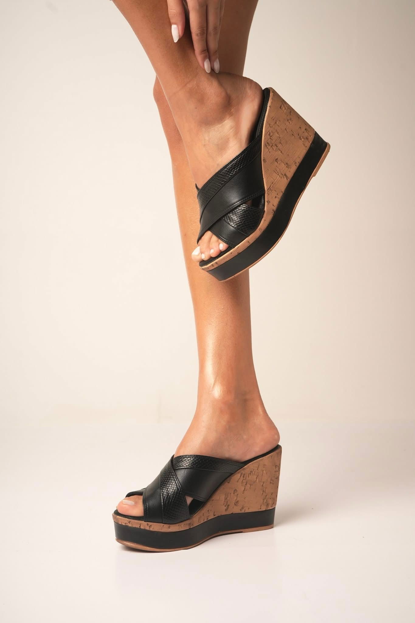Sandalias con capellada cruzada y base símil corcho. Livianas/ Taco aprox 10 cm