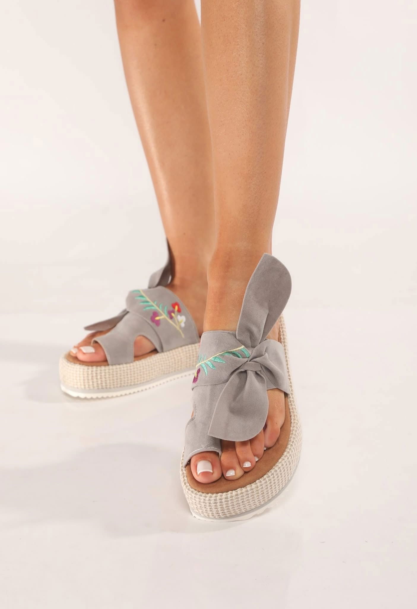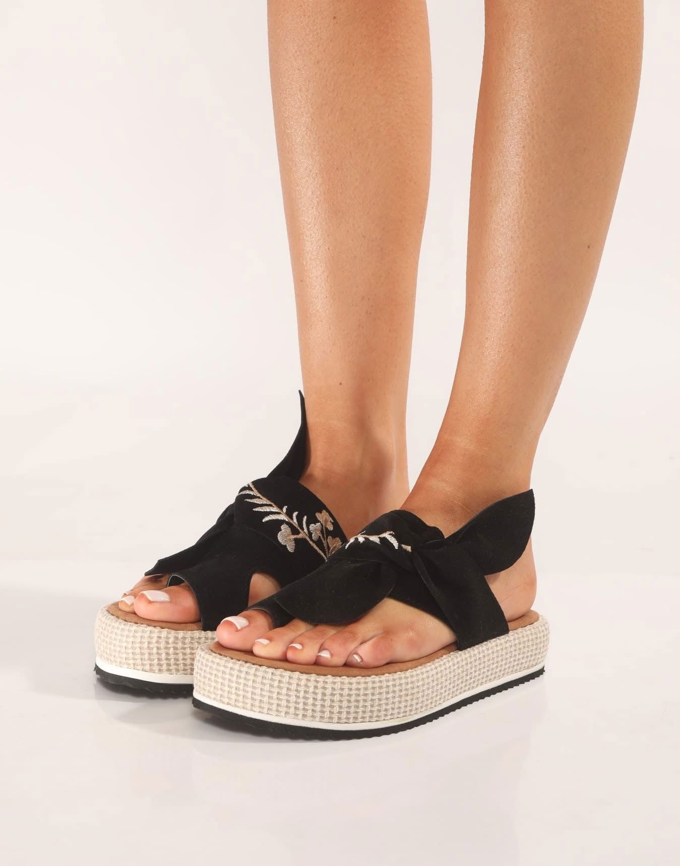 Sandalia con base forrada en rafia y detalle en bordado en capellada.