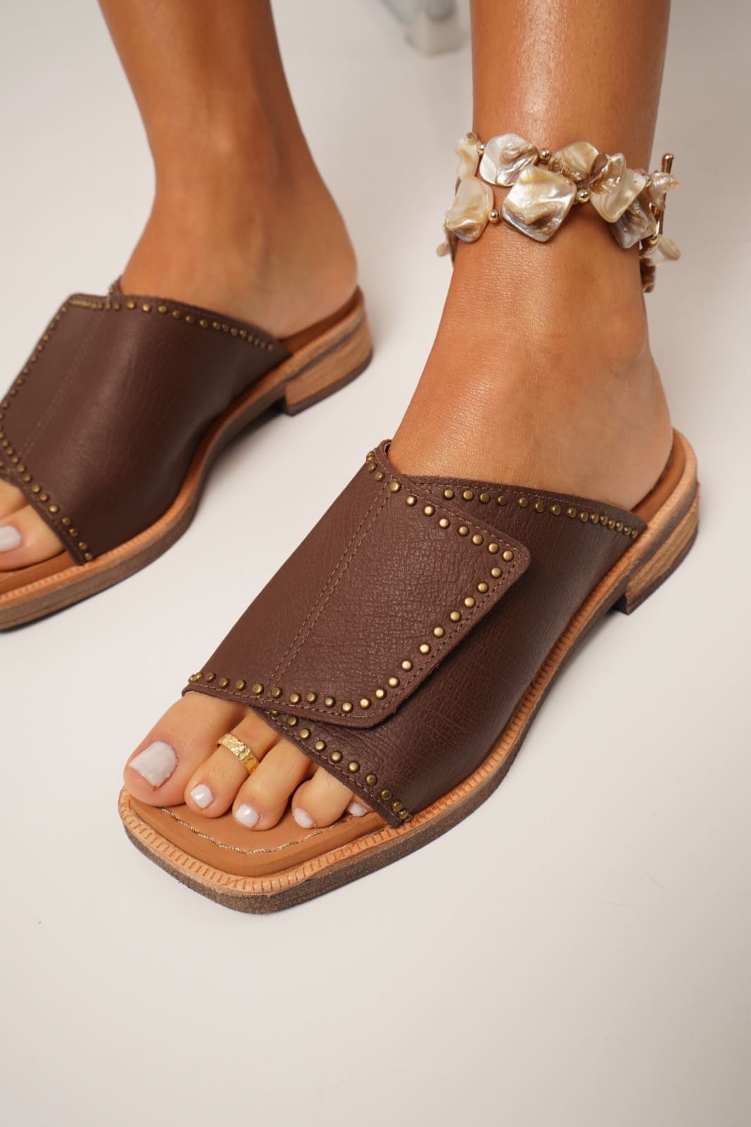 Hermosas Sandalias con capellada rectangular. Detalle en tachas y puntera cuadrada. Taco de 3 cm