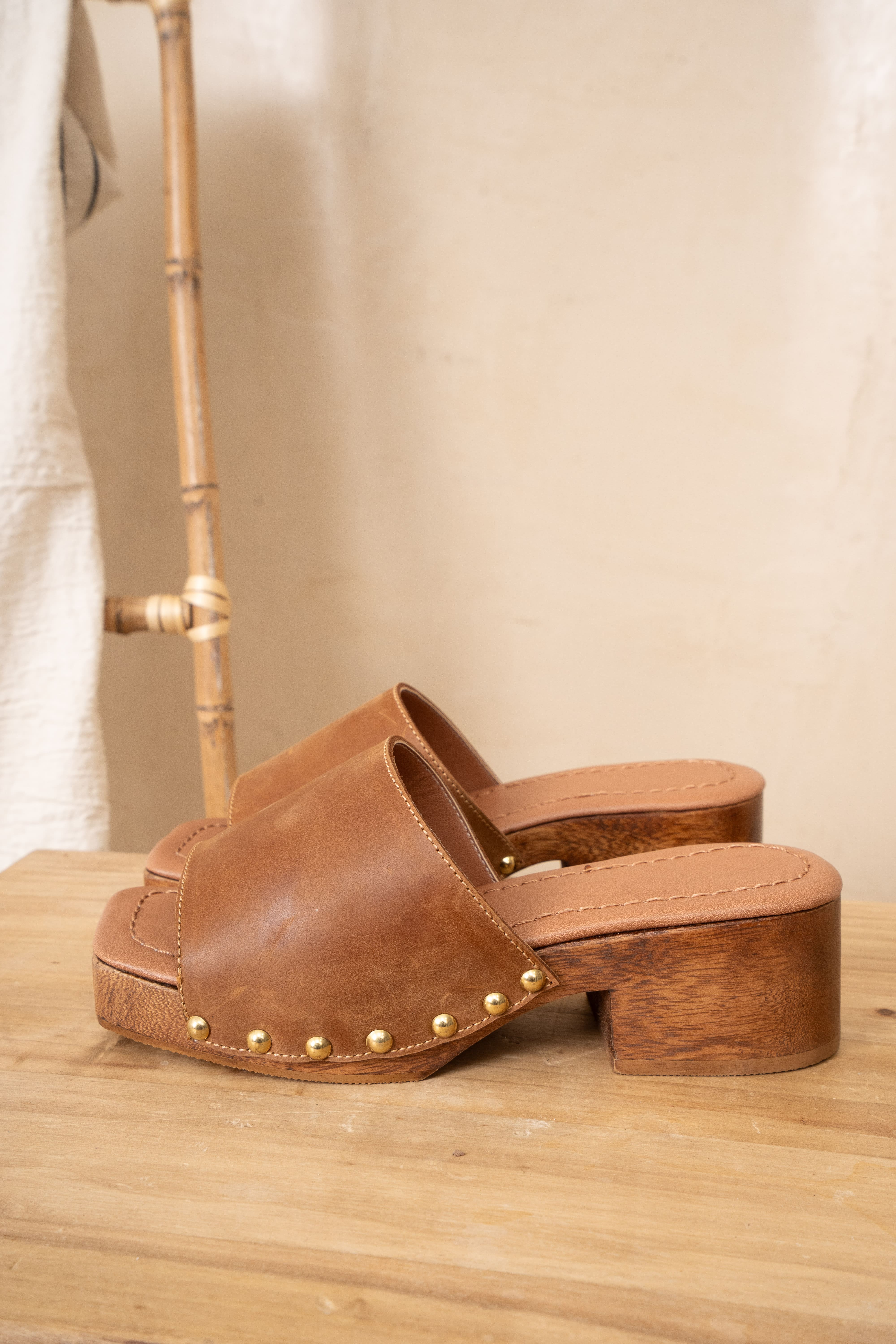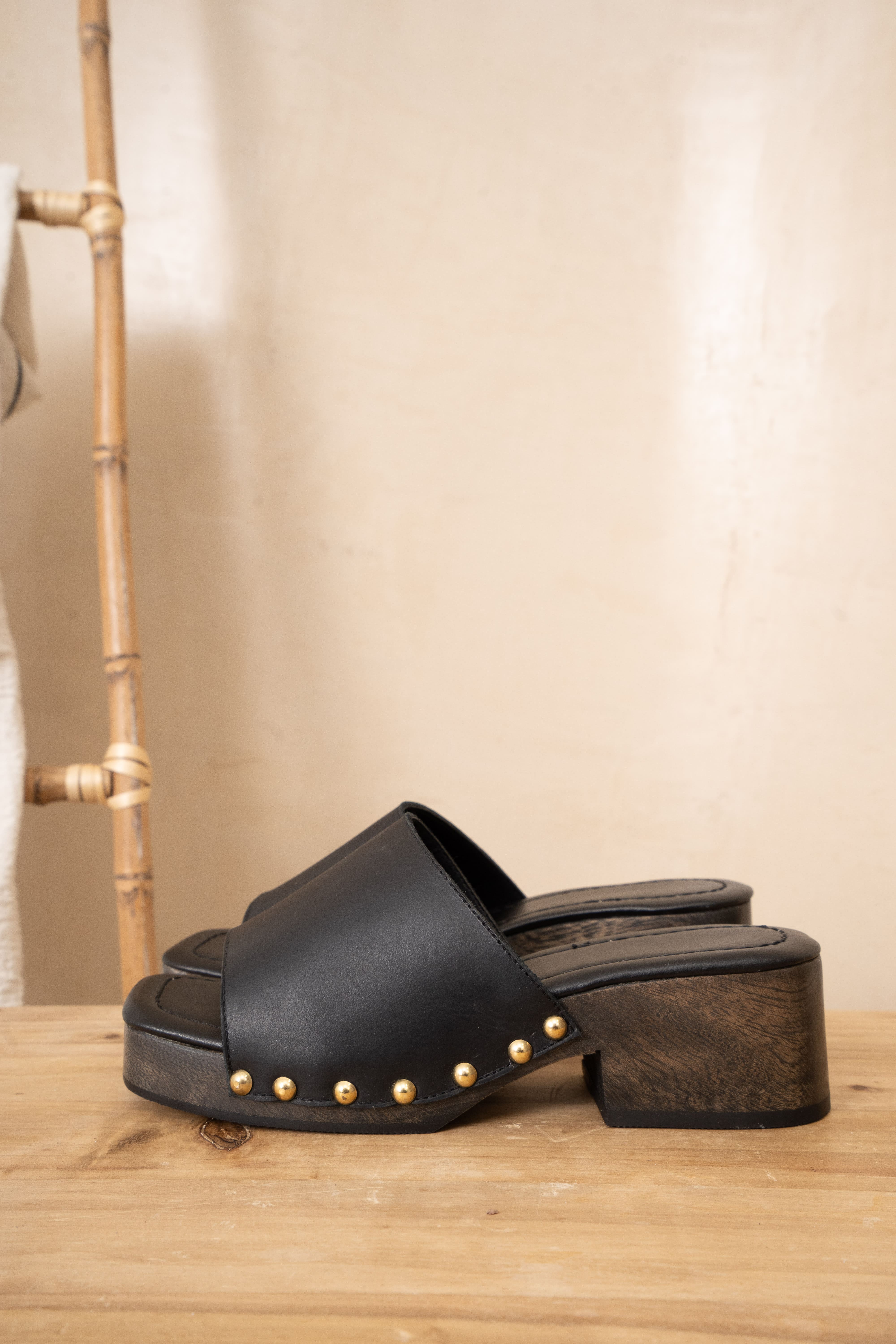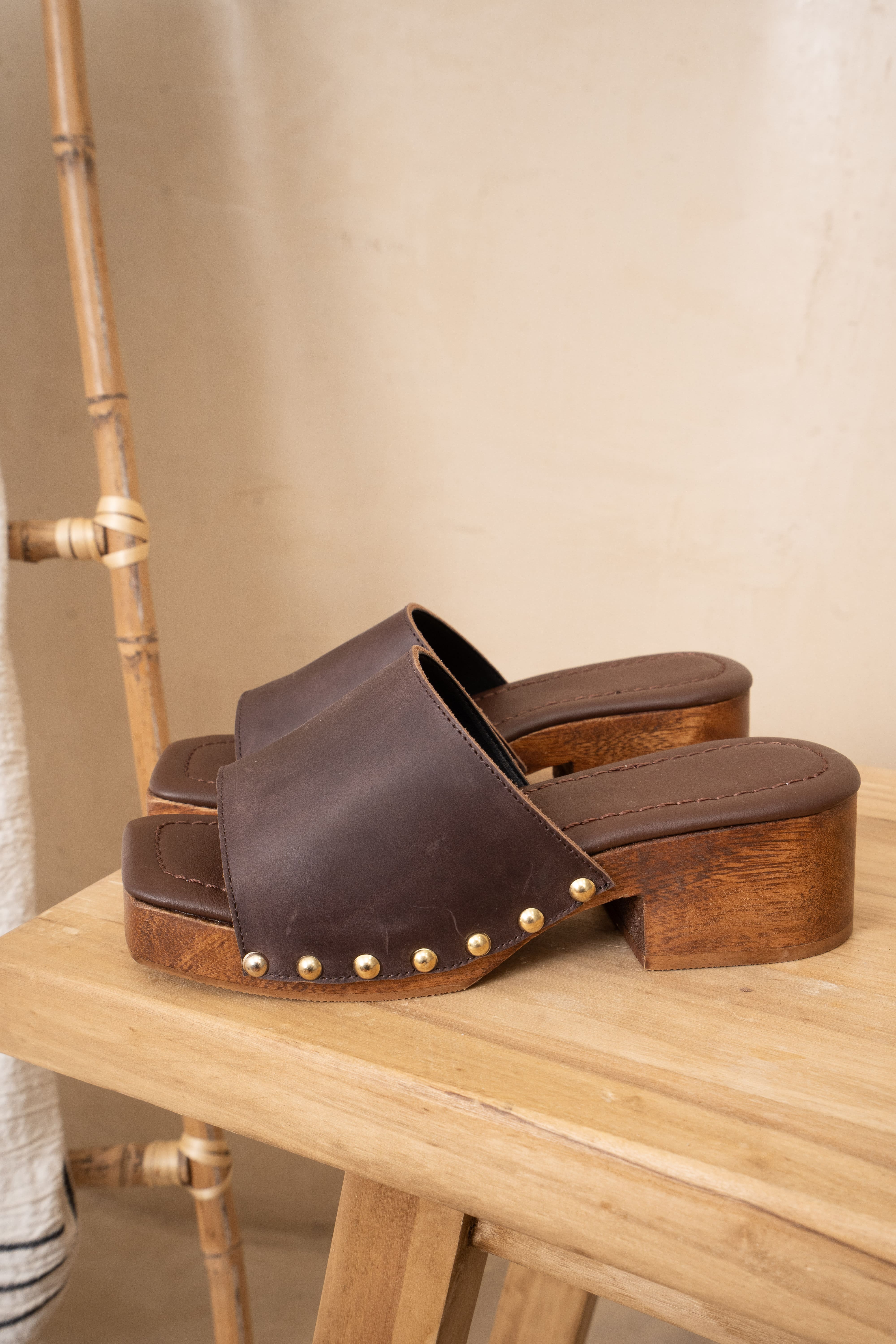 Zueco con taco de madera y detalle en tachas. Taco 5 cm aprox. Plantilla forrada. Base antideslizante