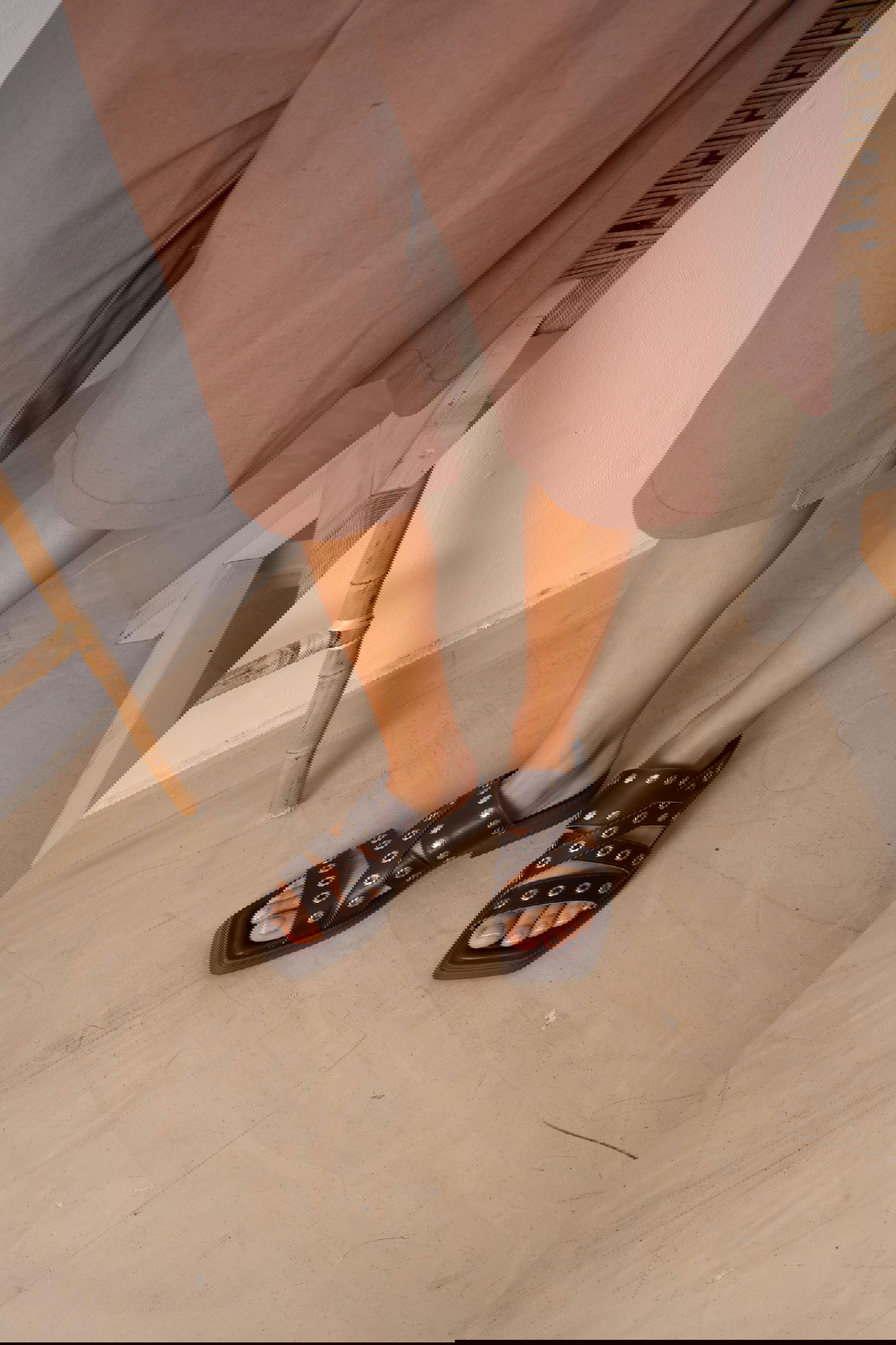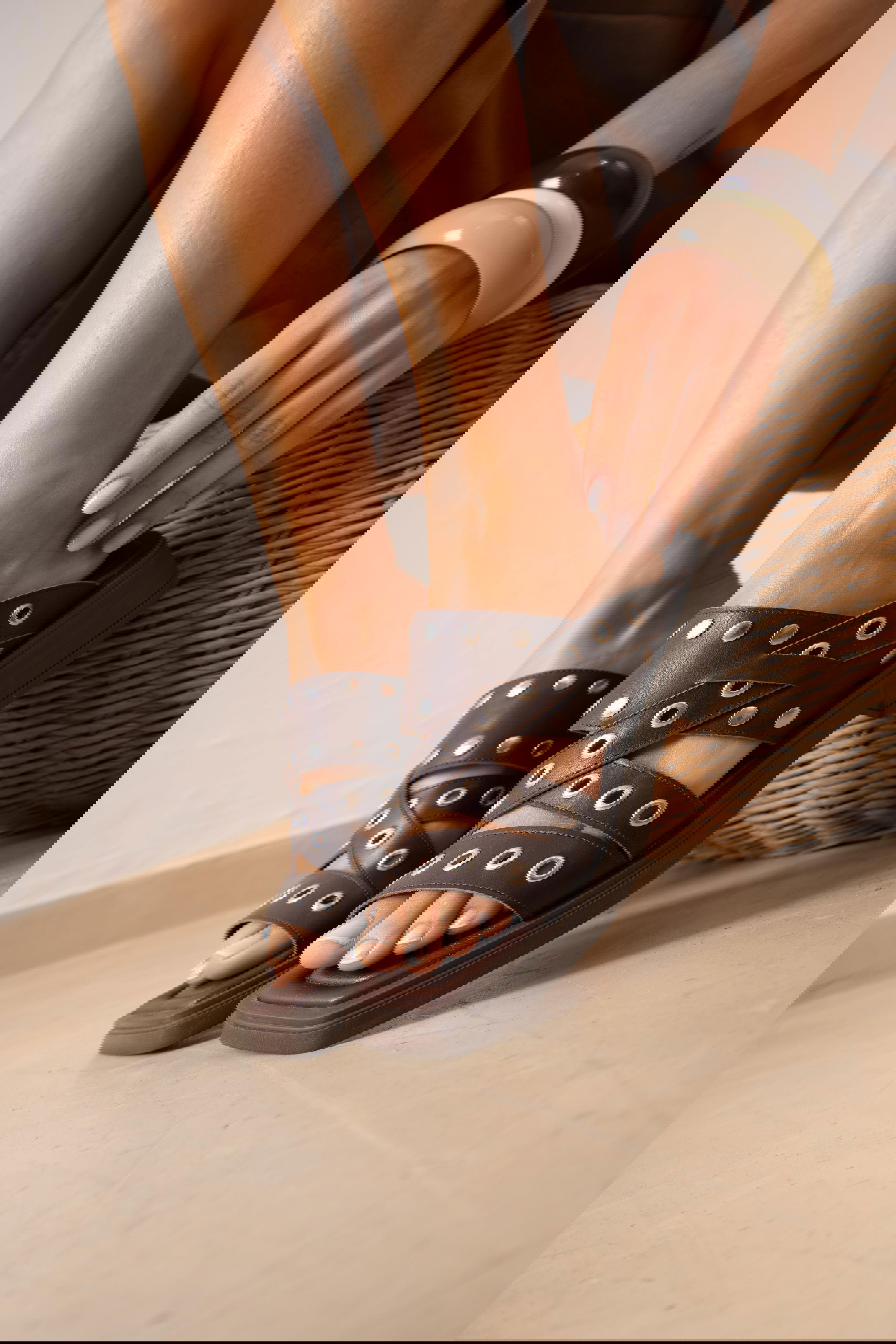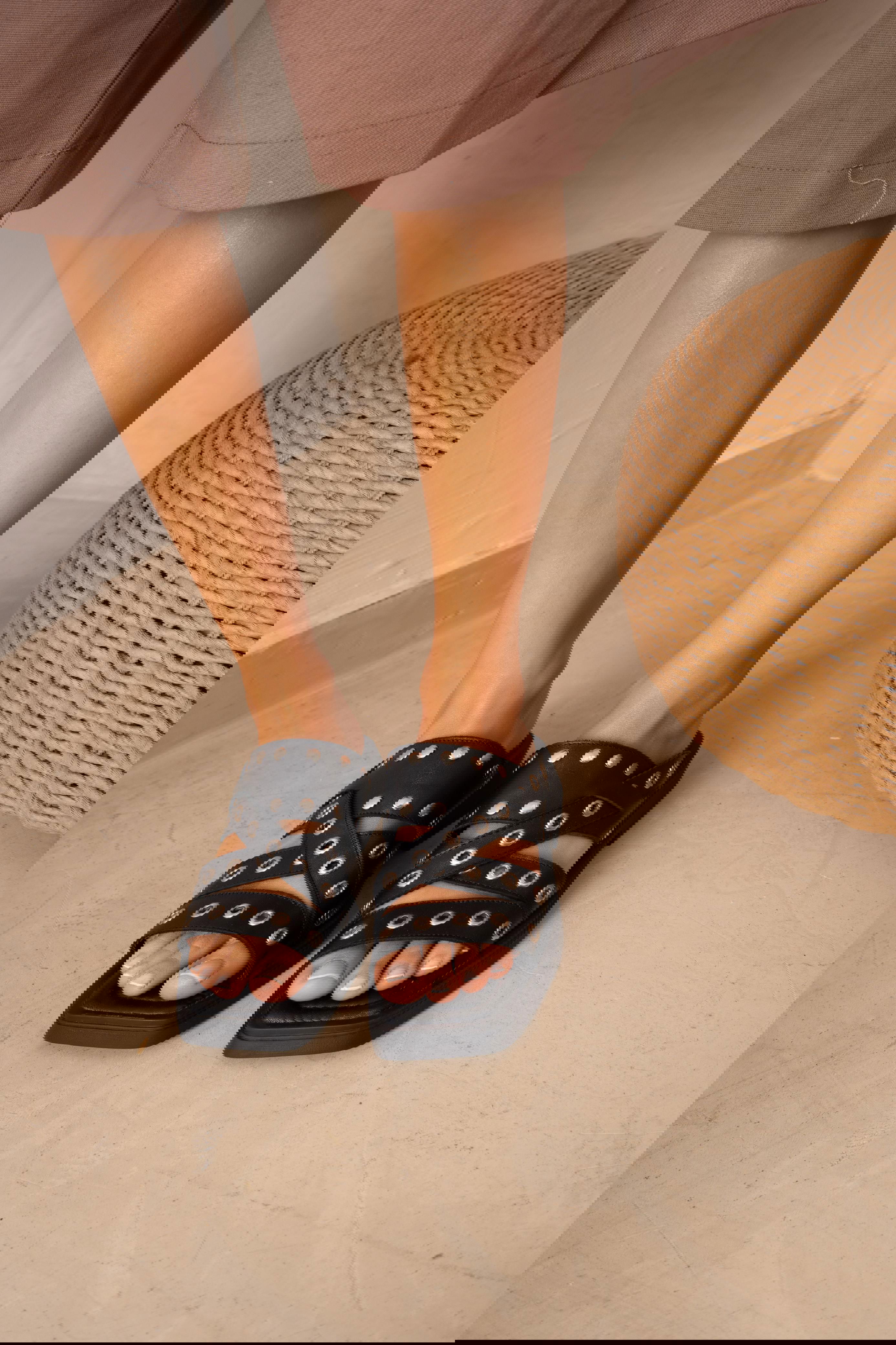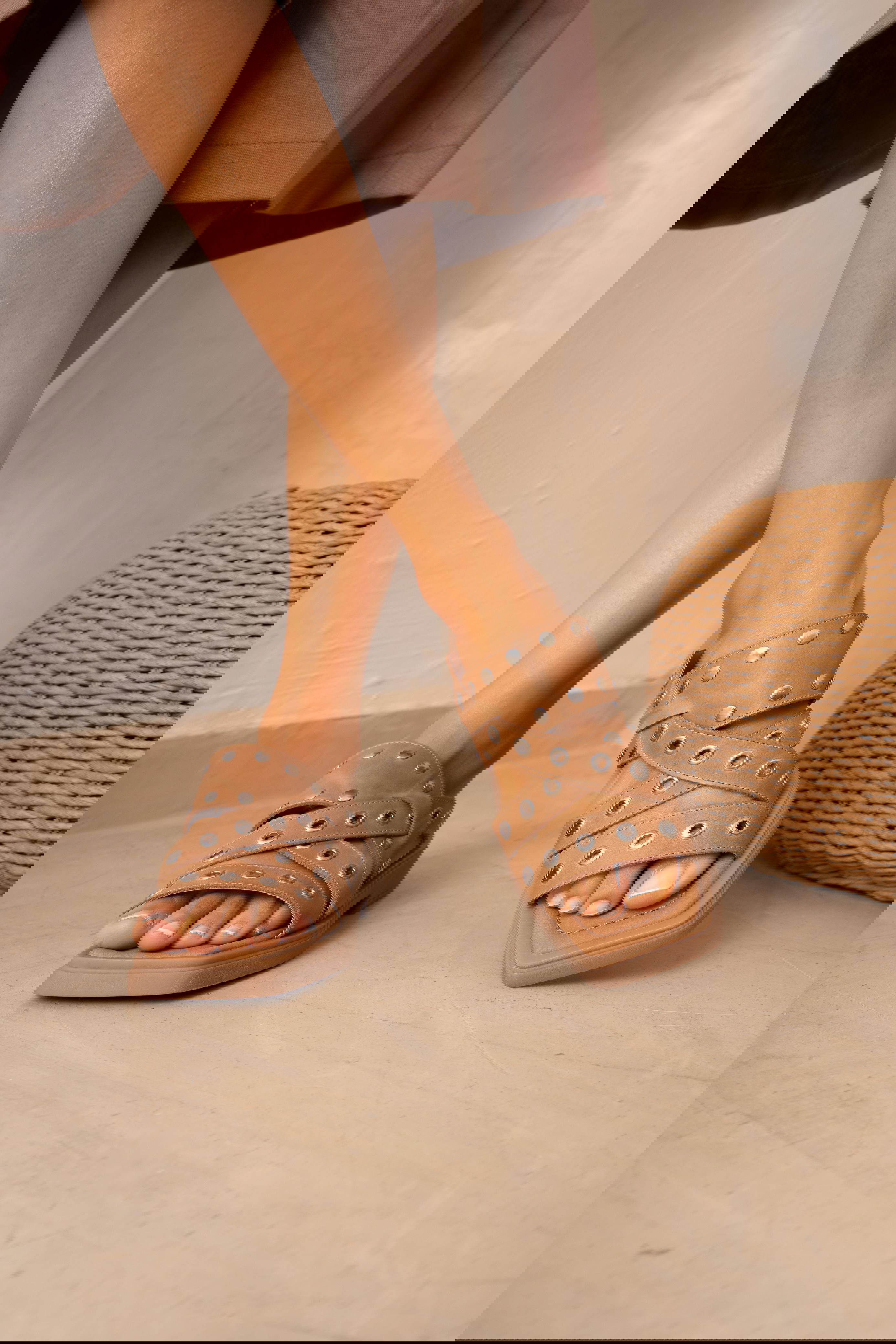 Sandalia bajita con tachas y ojalillos. Plantilla cosida y forrada. Base TR.