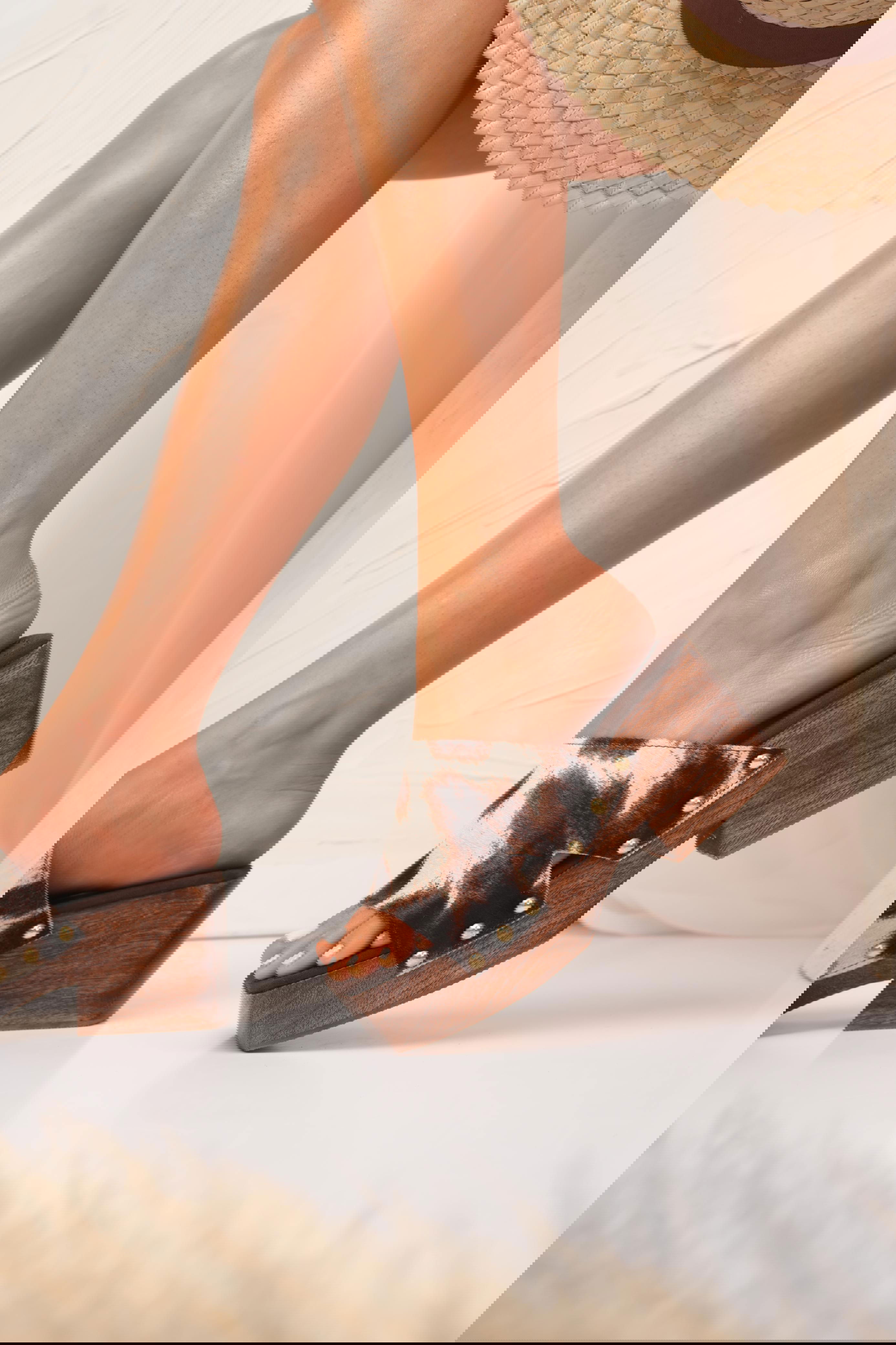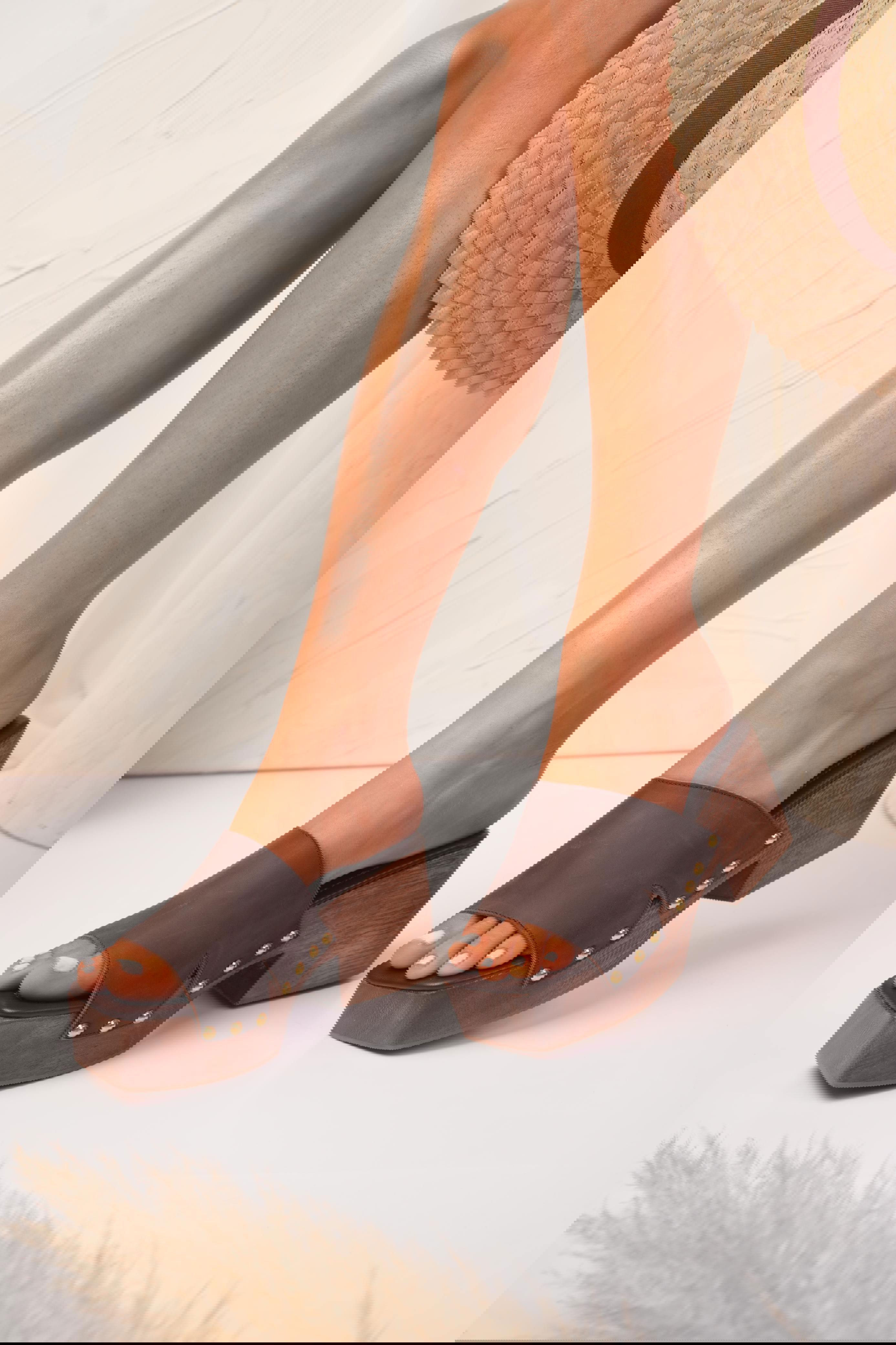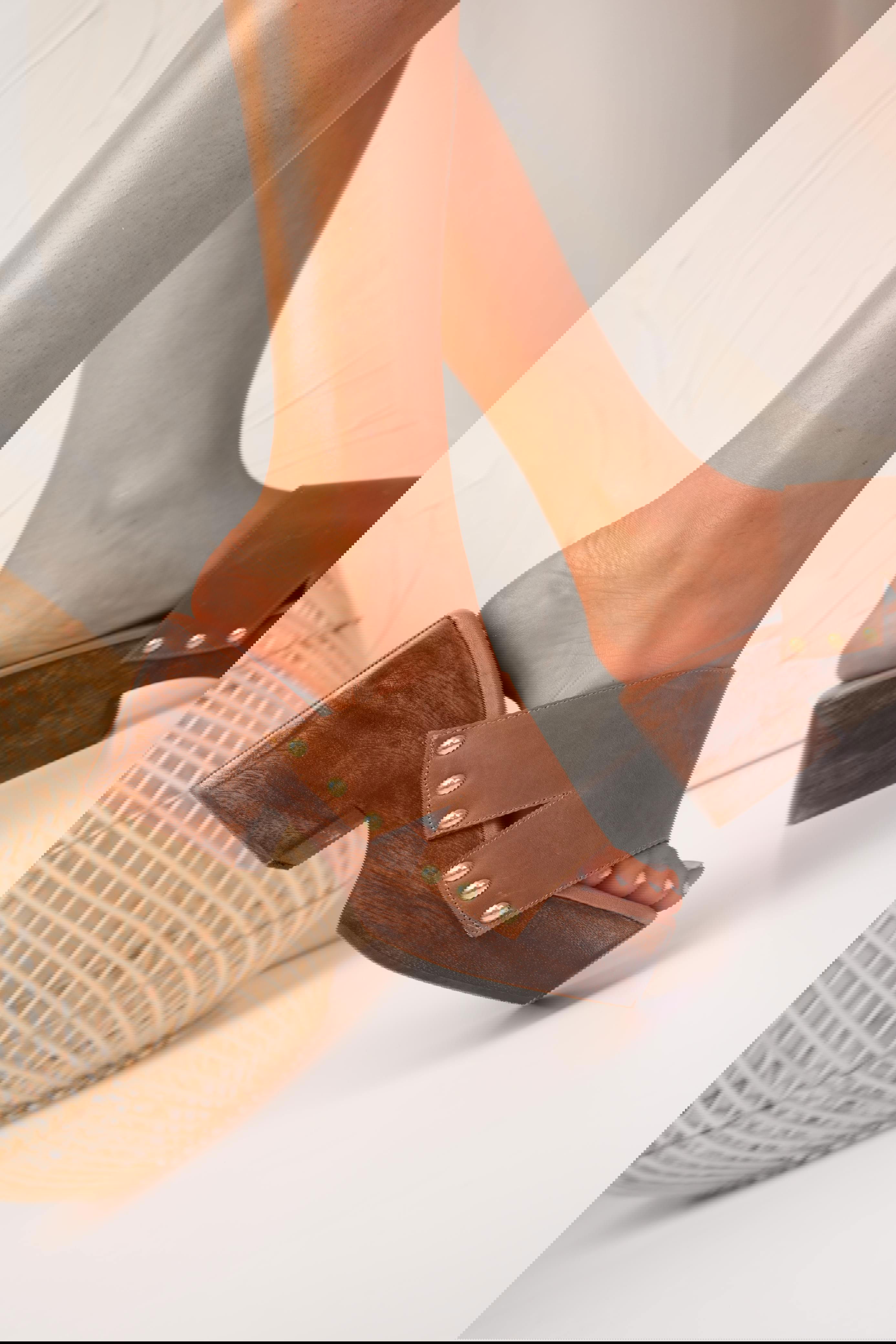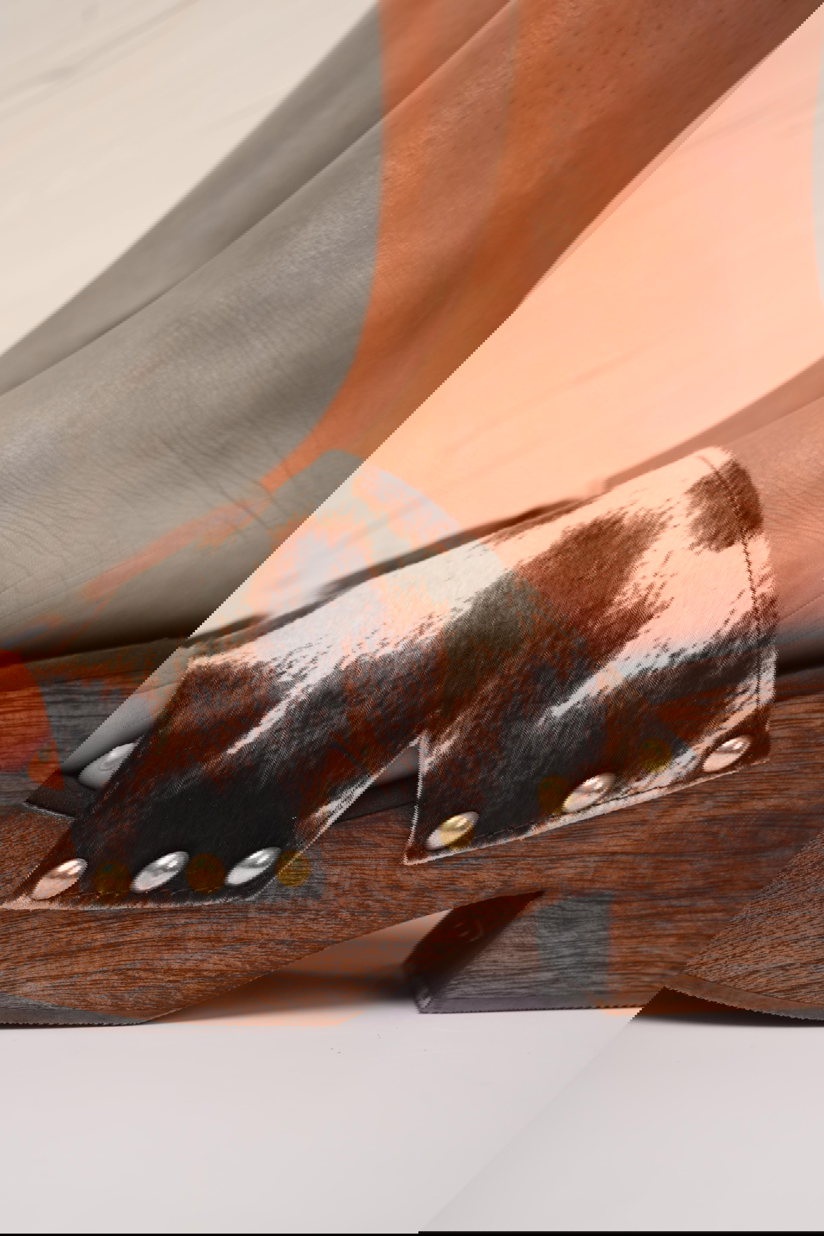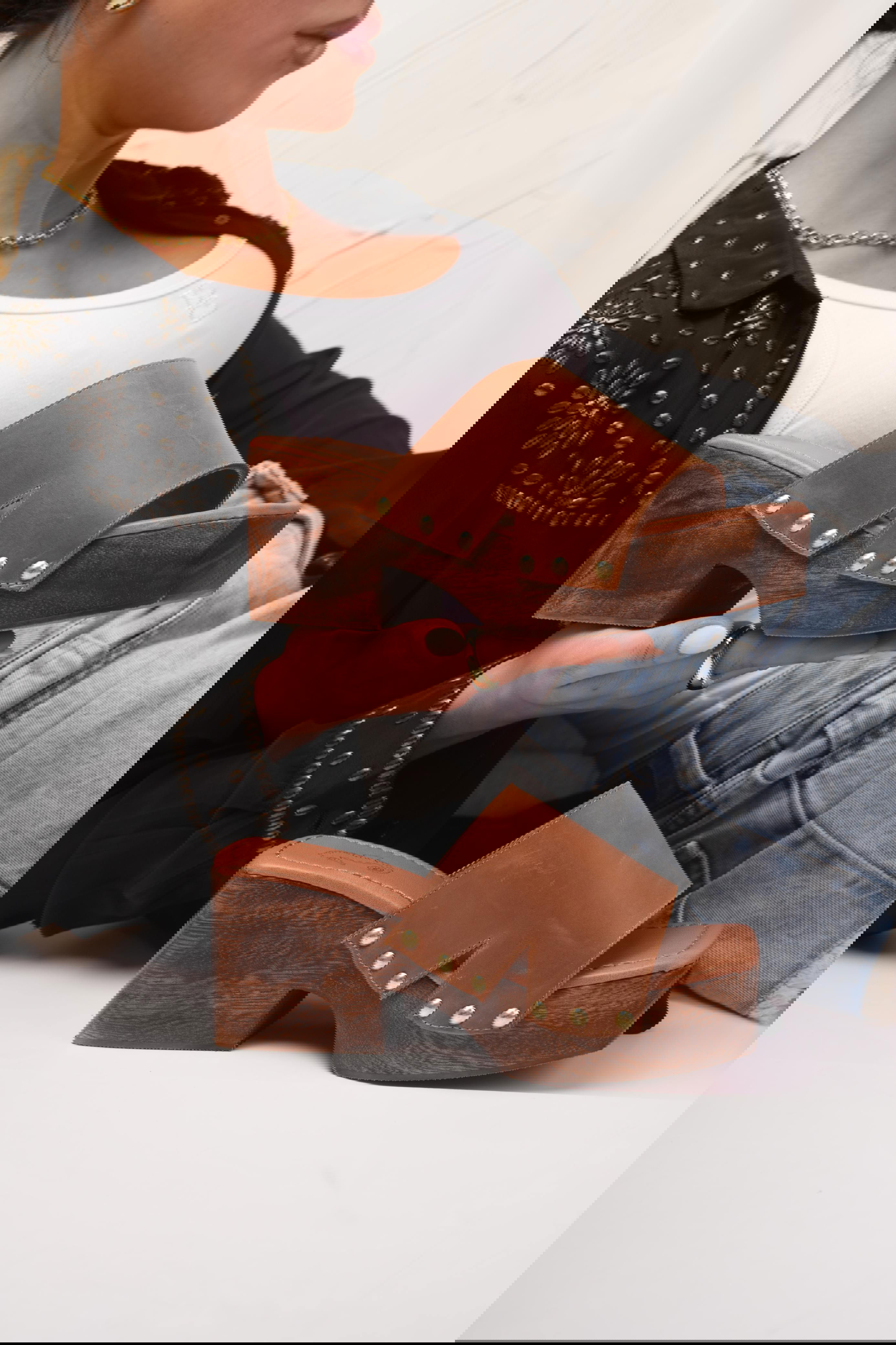 Zueco con taco de madera (kiri) y detalle en tachas. Taco 8 cm aprox. Plantilla forrada. Base artesanal antideslizante.