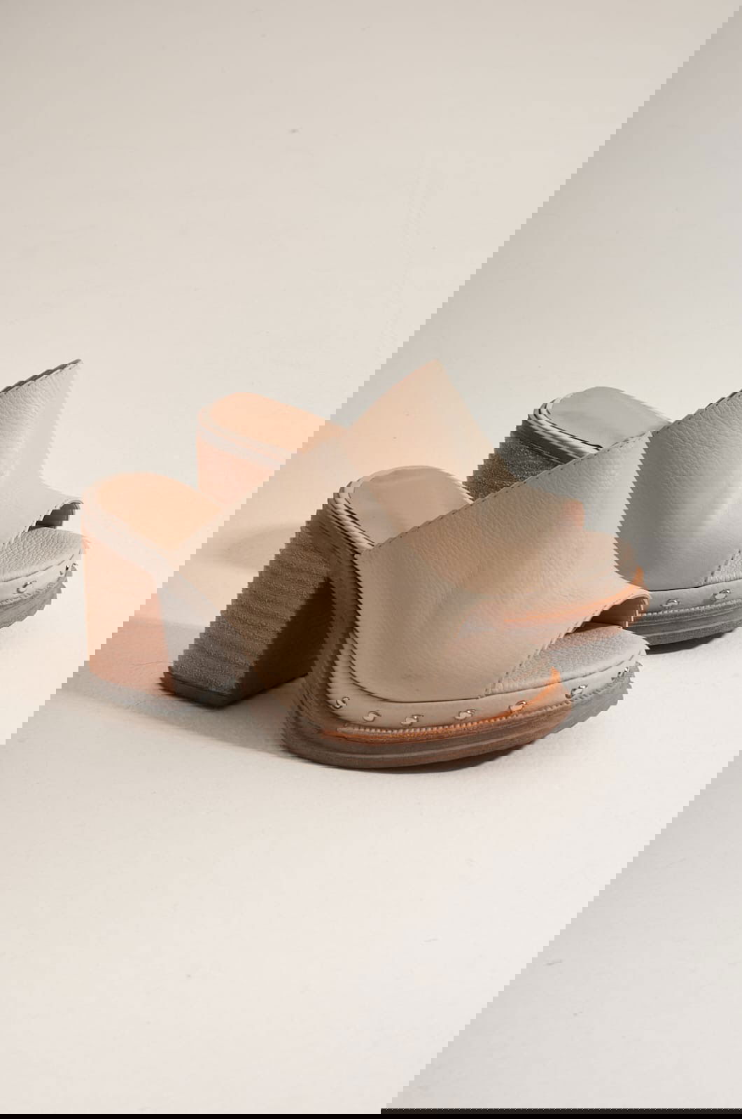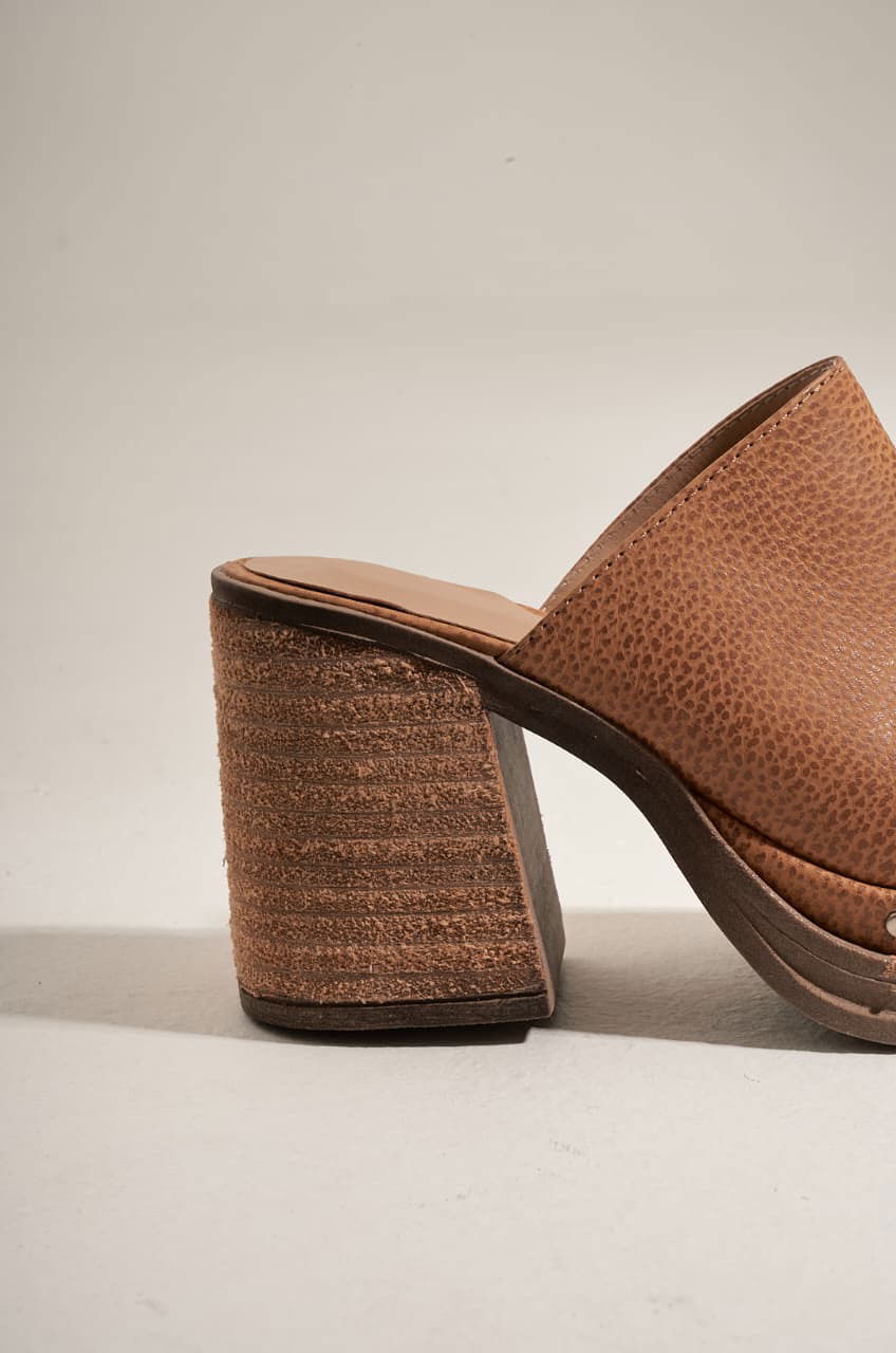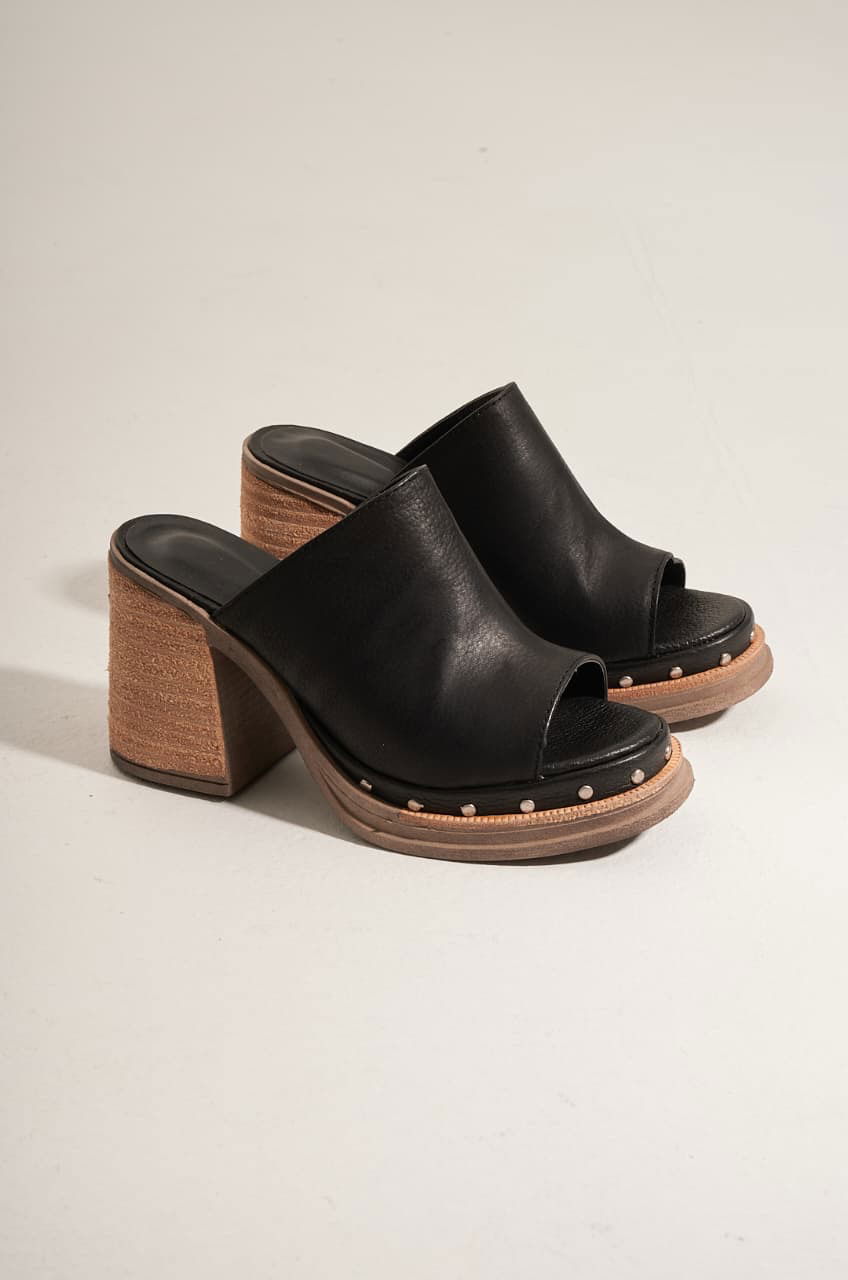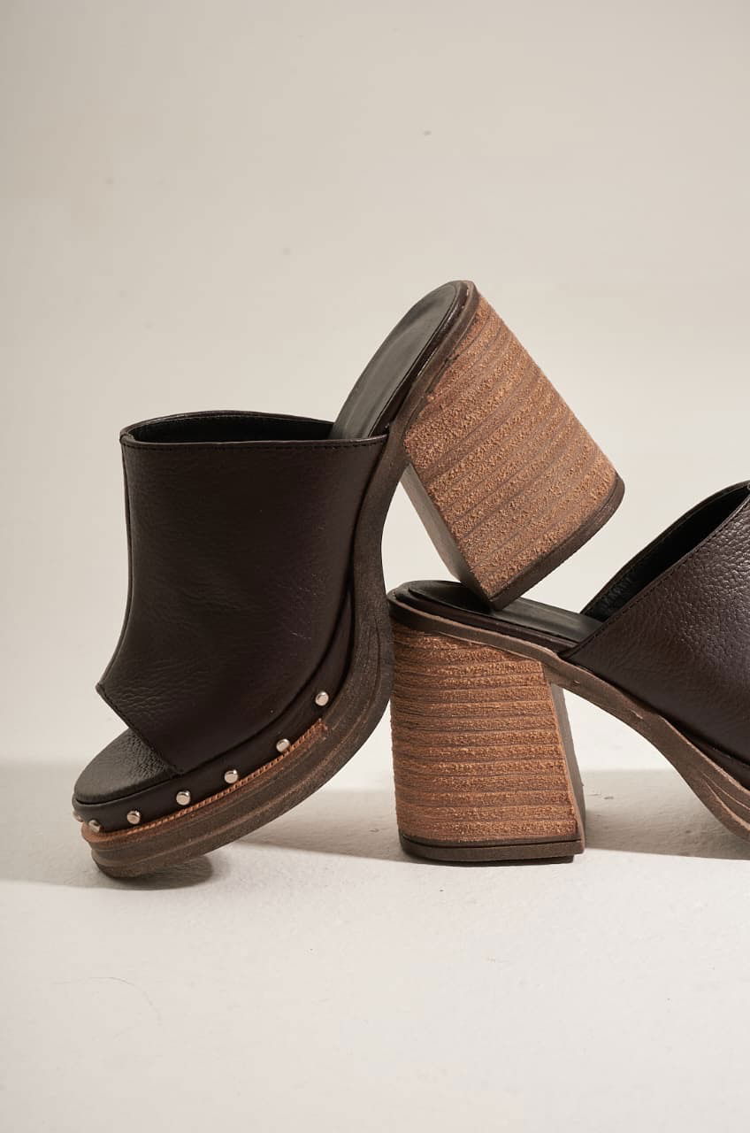 Zuecos con base de 3 cm con detalle en contorno de tachas. Taco de 8 cm, detalle foliado.