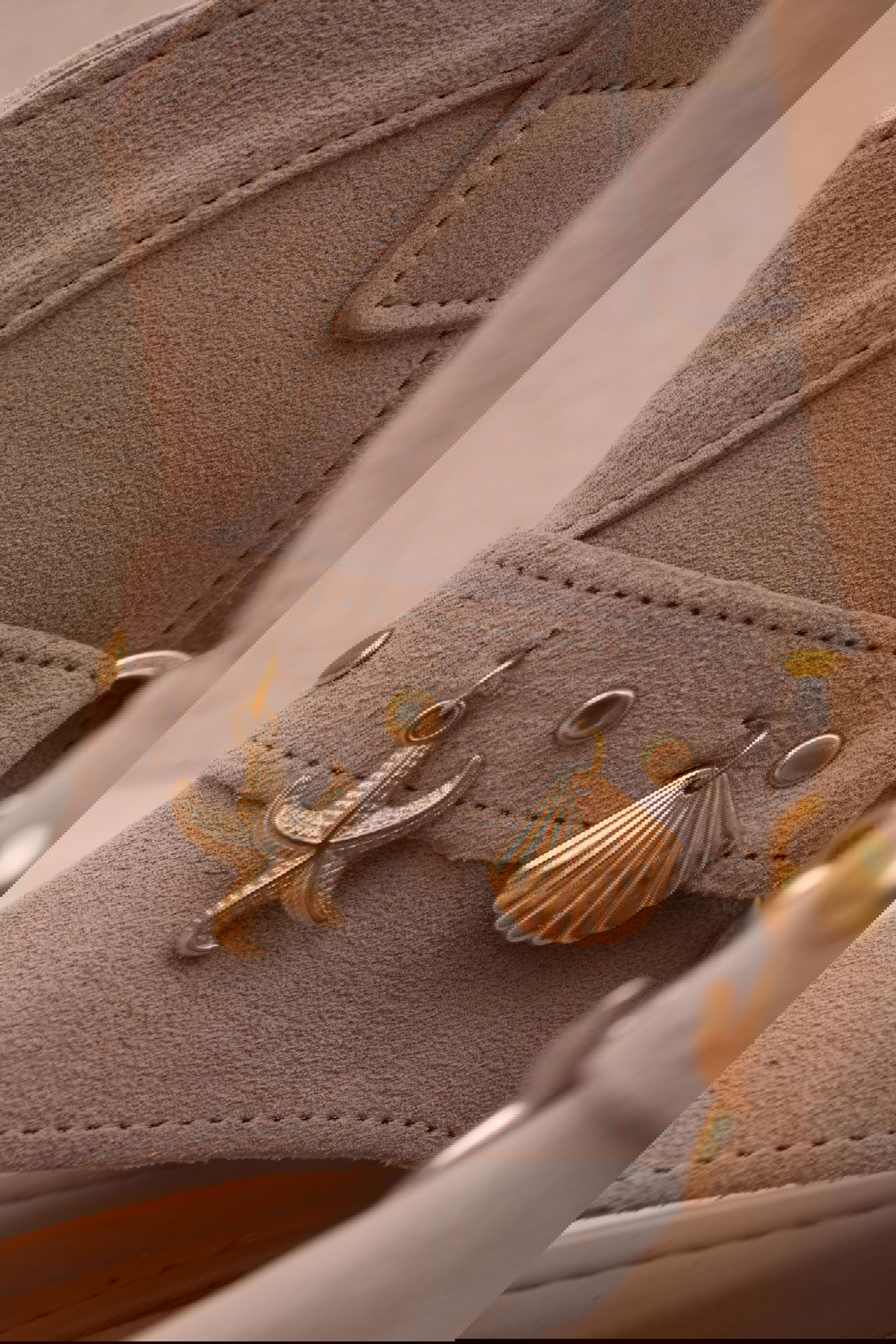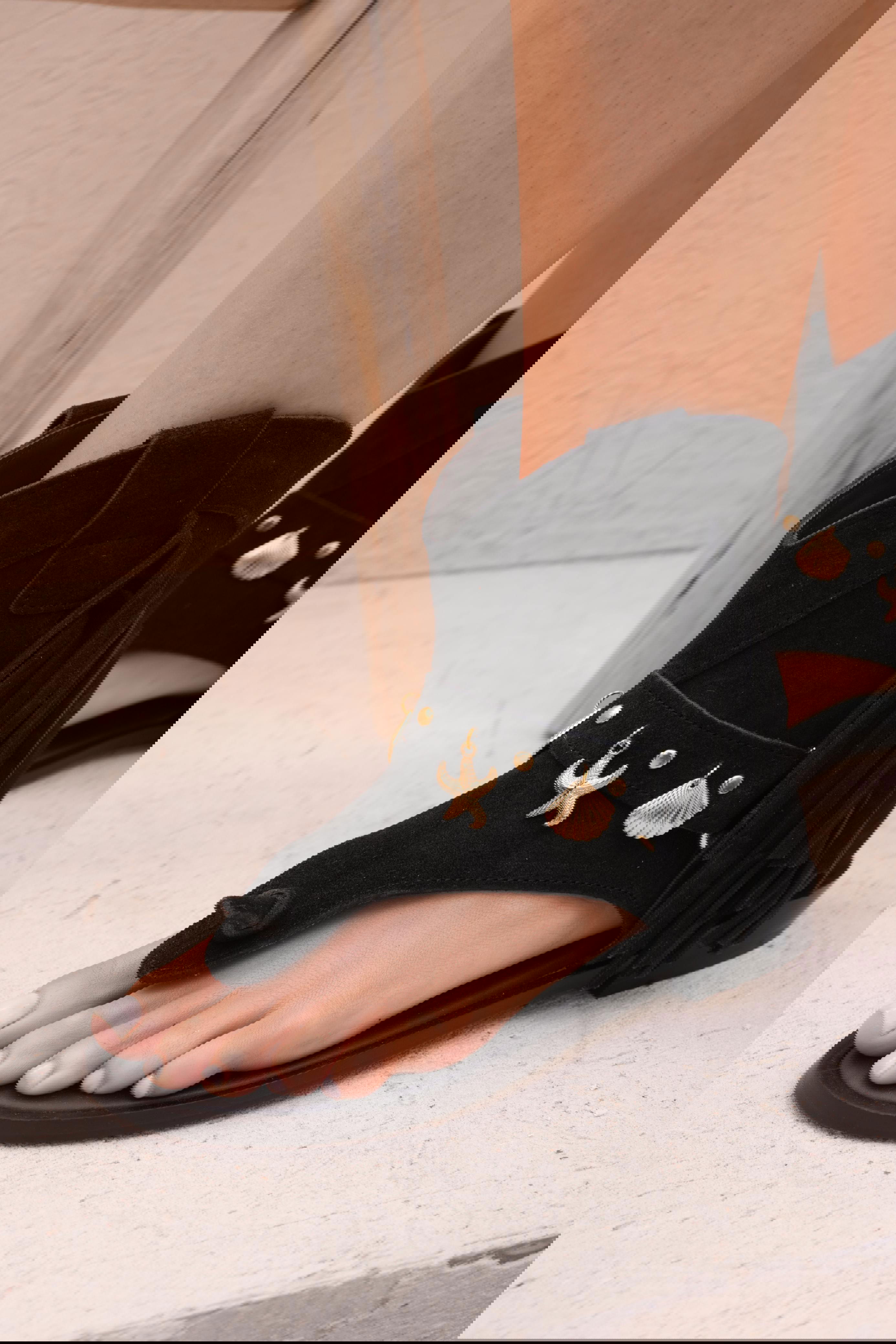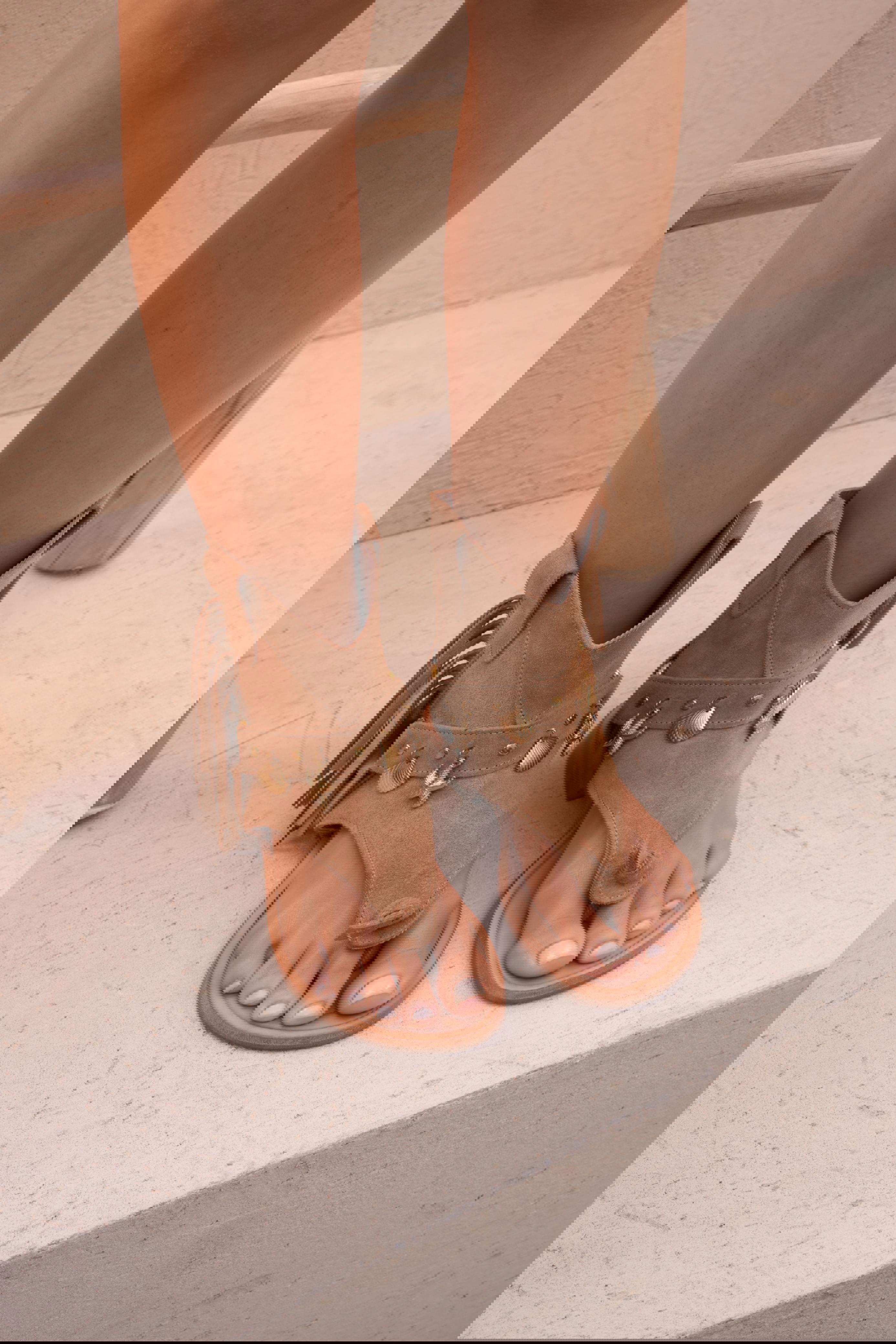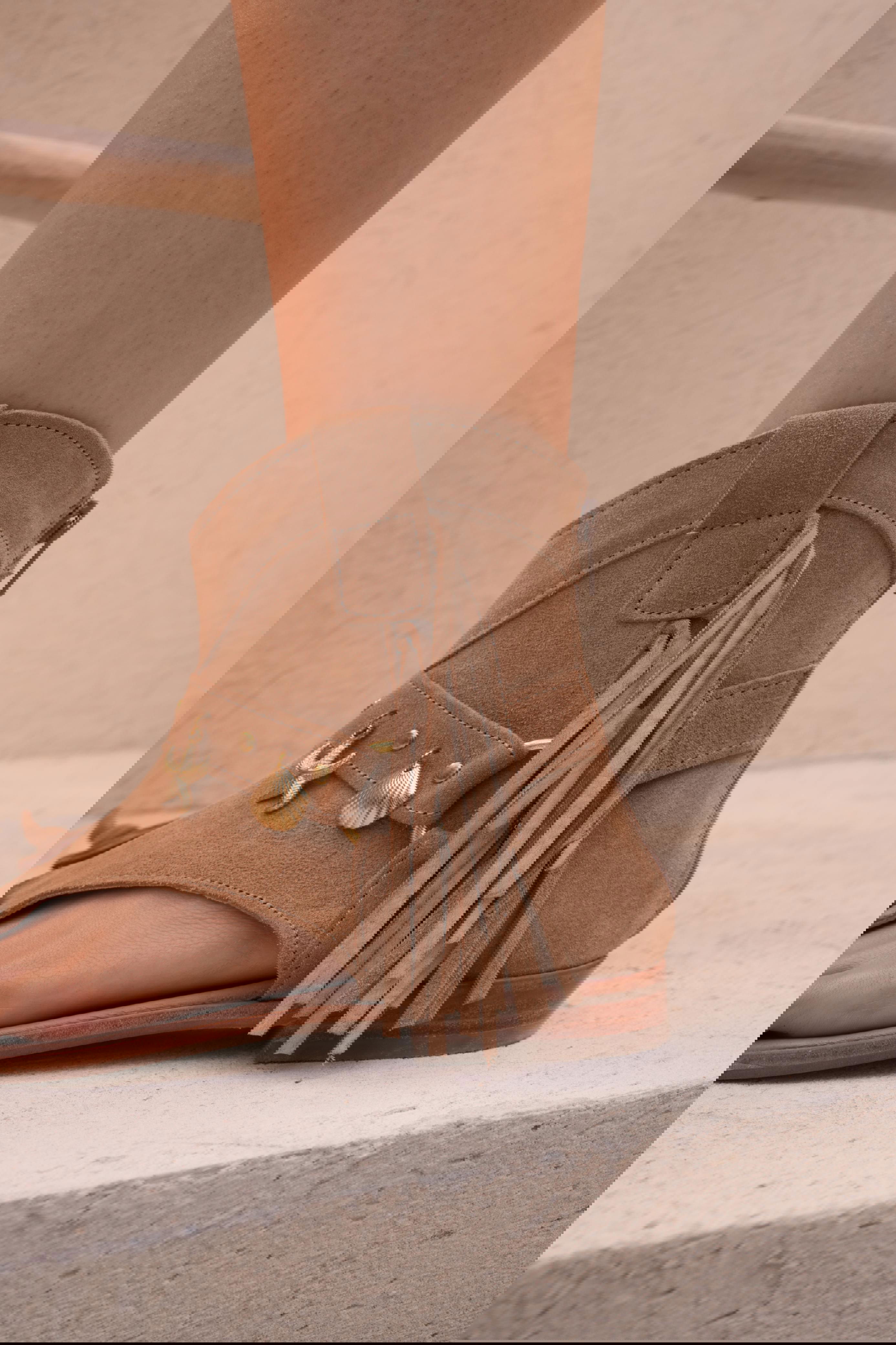 Sandalia estilo BOHO con capellada con flecos. Base artesanal. Plantilla forrada y cosida. Cinto con apliques de mar