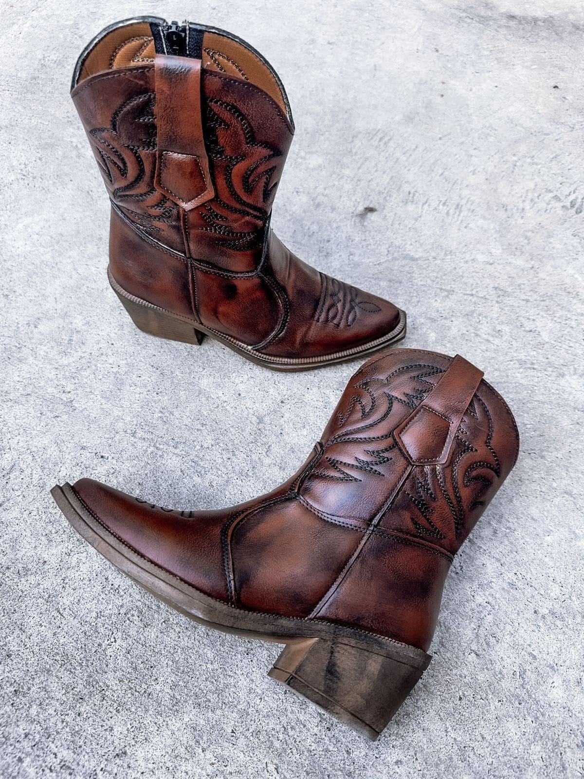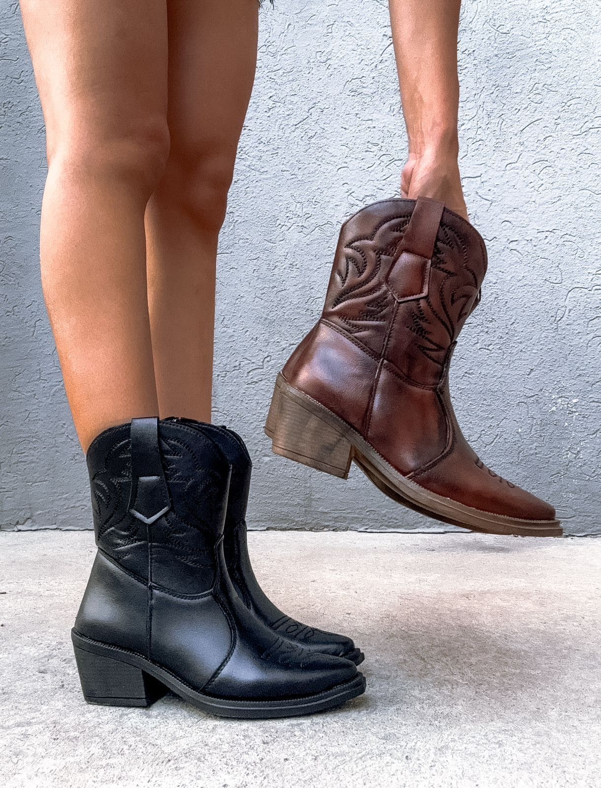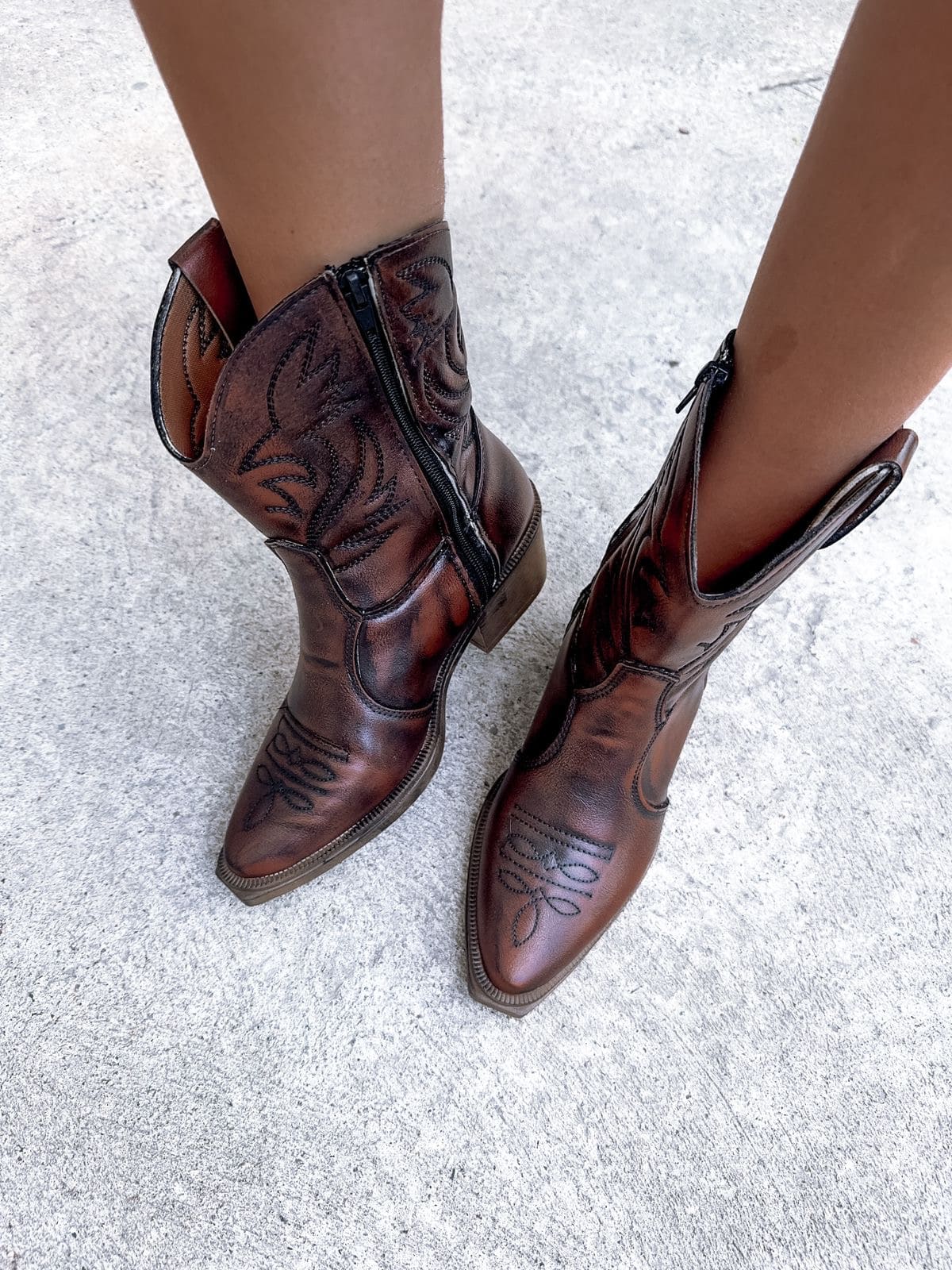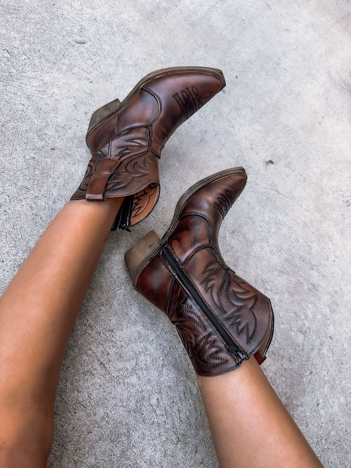 Bota caña corta bordada. Taco foleado de 4 cm.