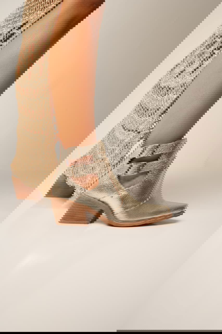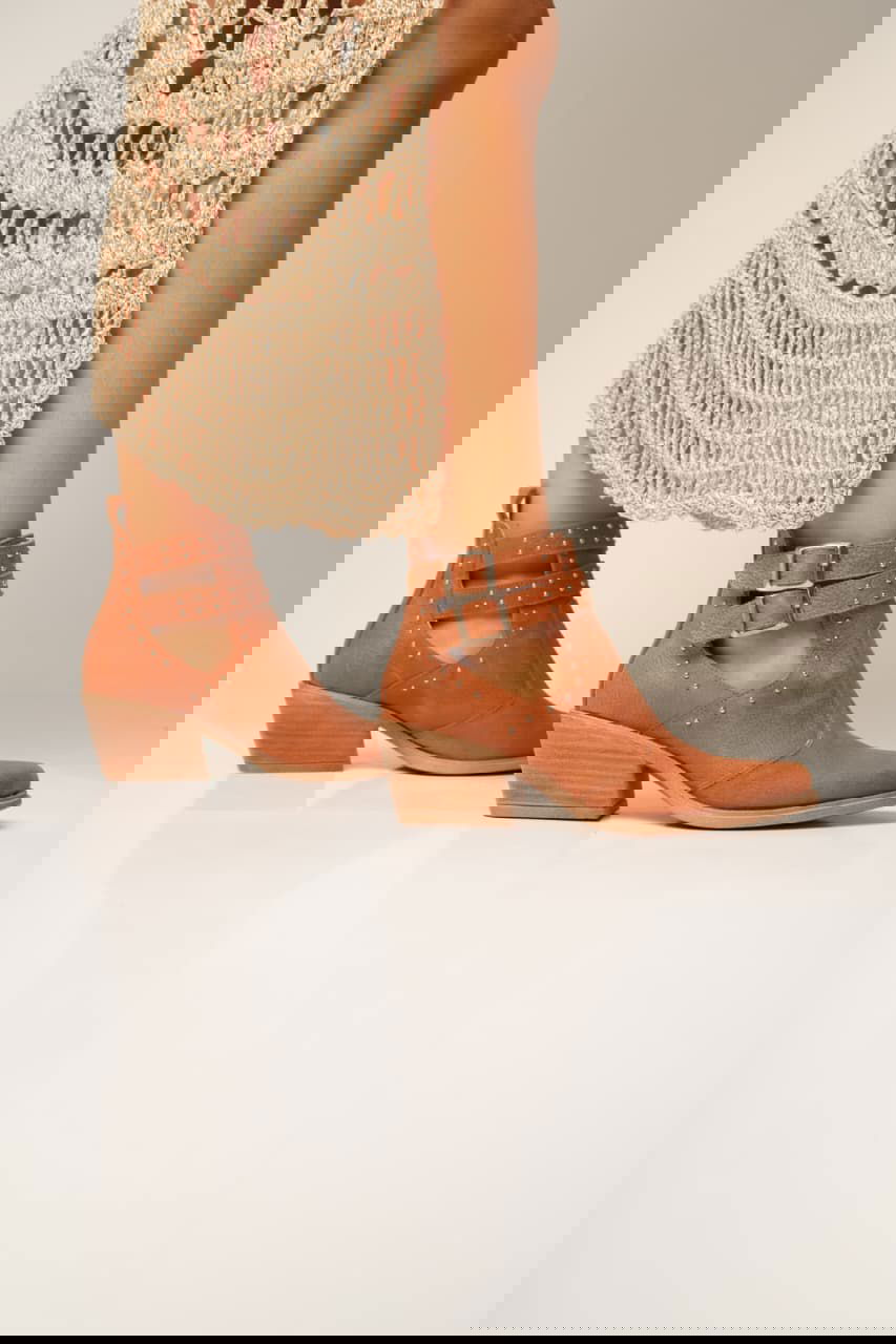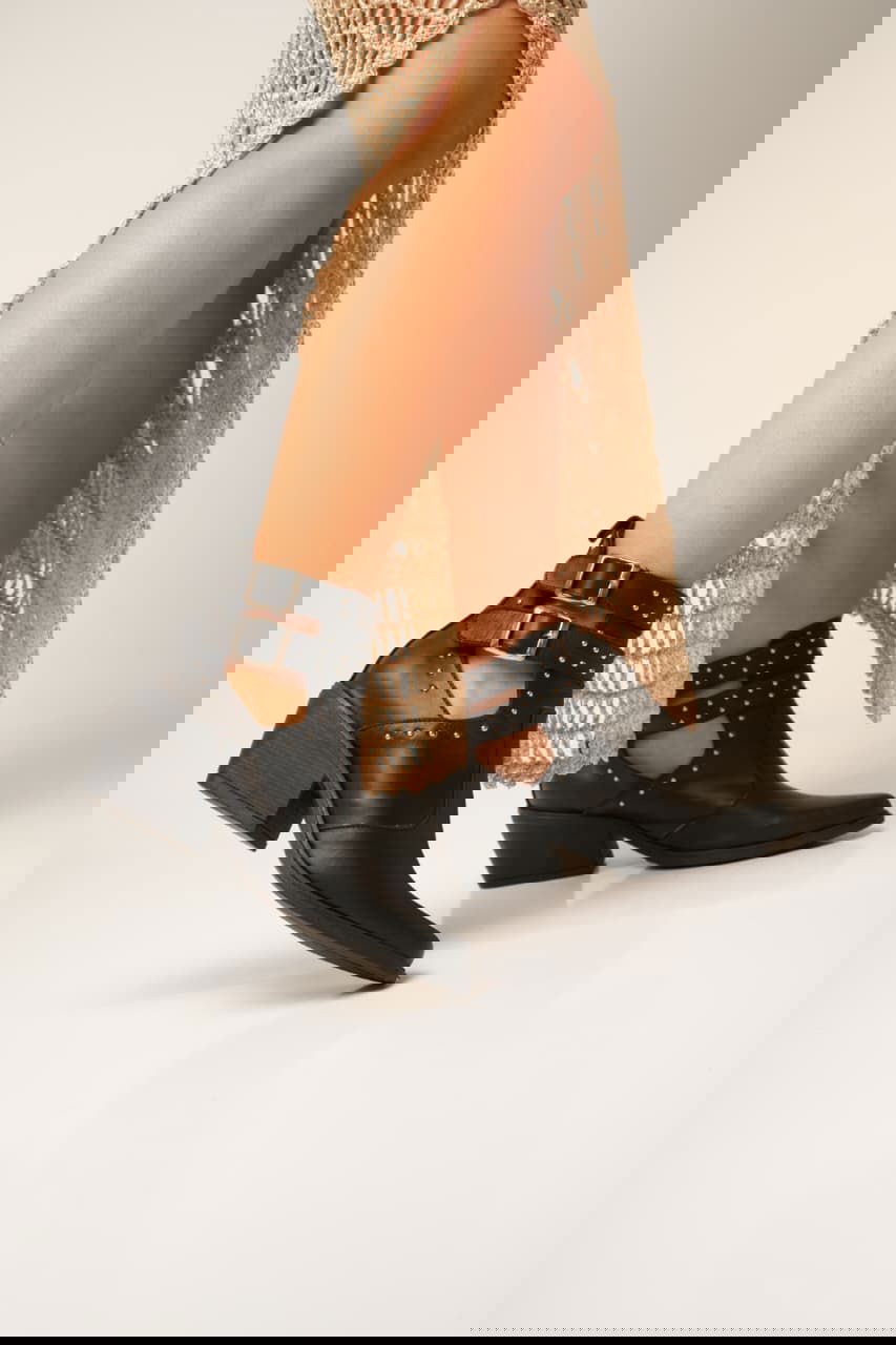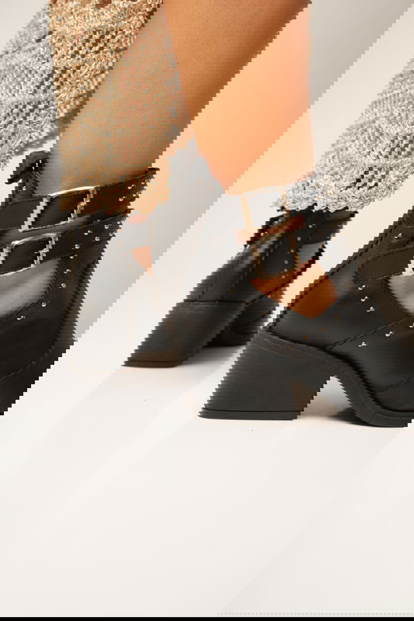 Botas semiabiertas con detalle en tachas y doble hebilla. Taco 5 cm. Base antideslizante