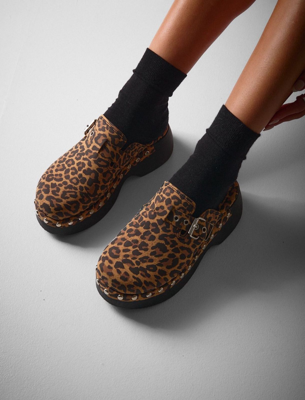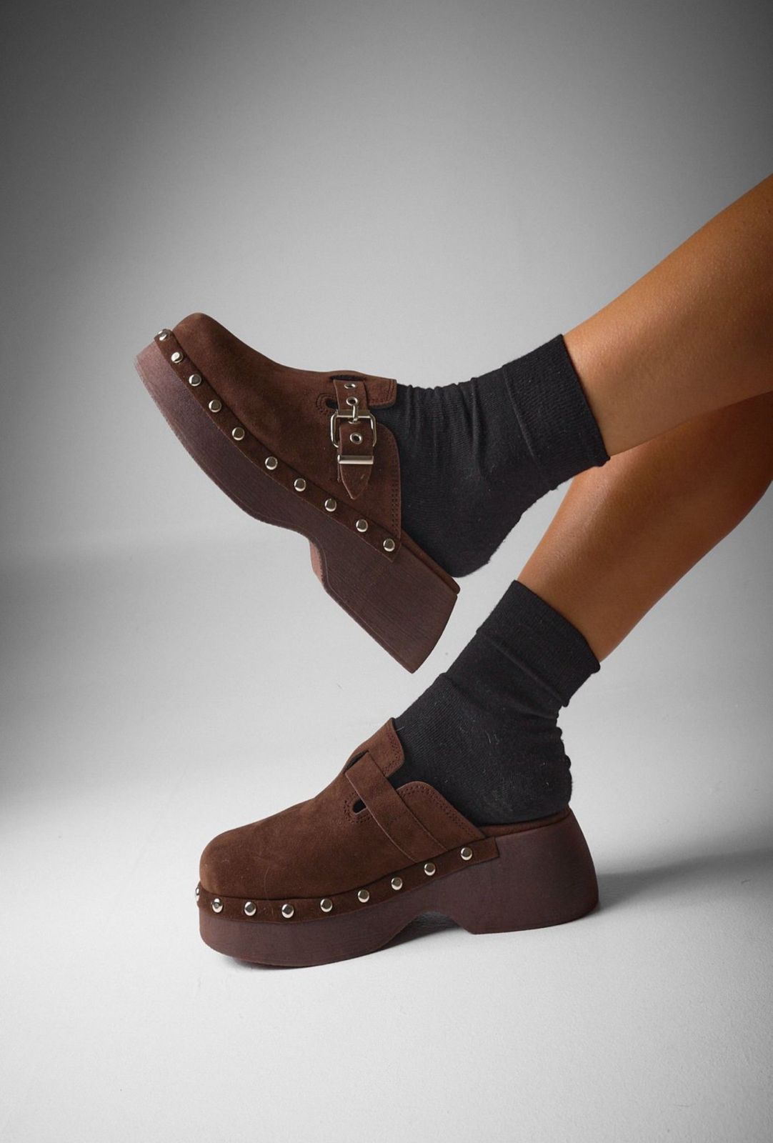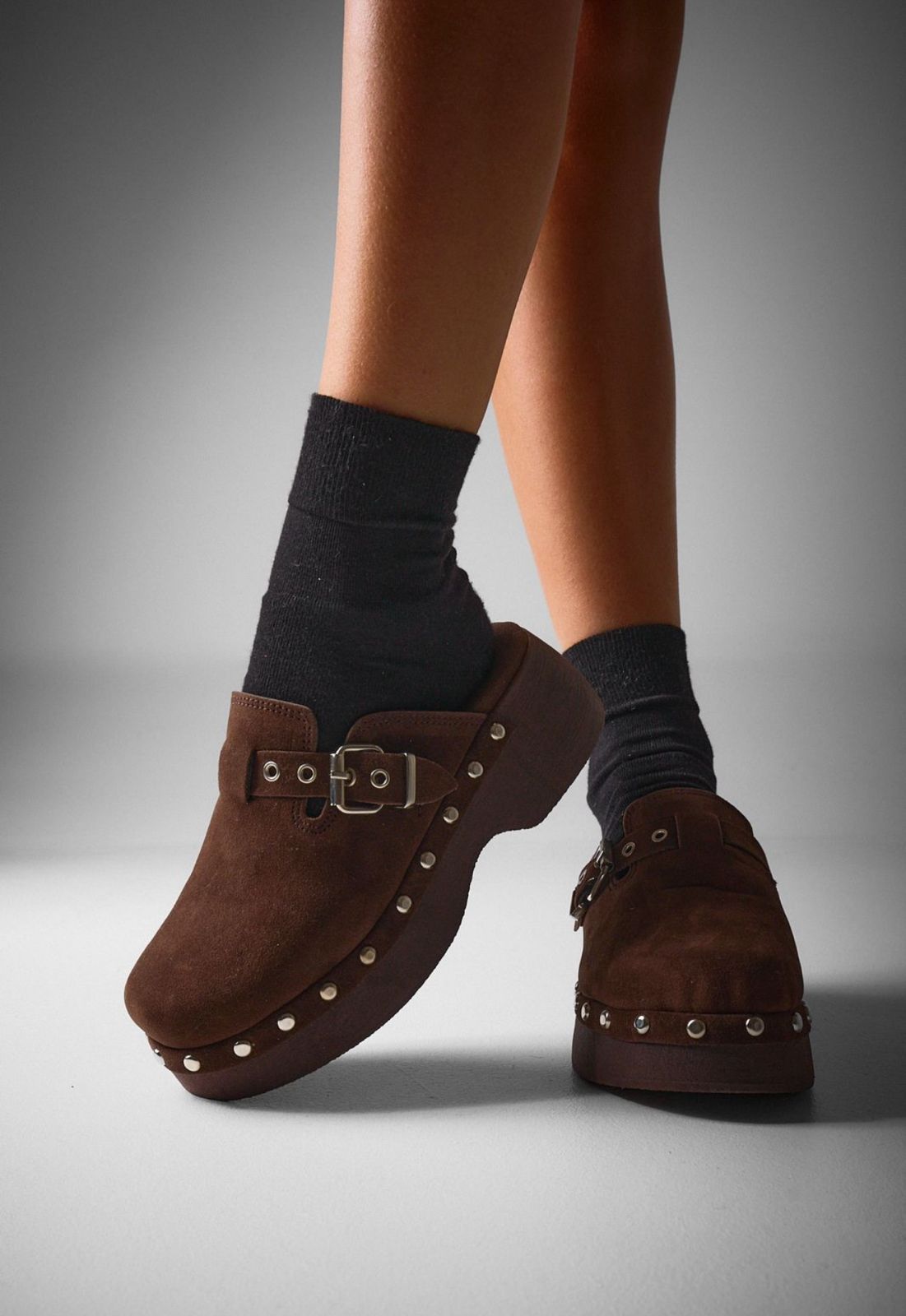 Zuecos con base liviana. Detalles en tachas. Sin talonera.