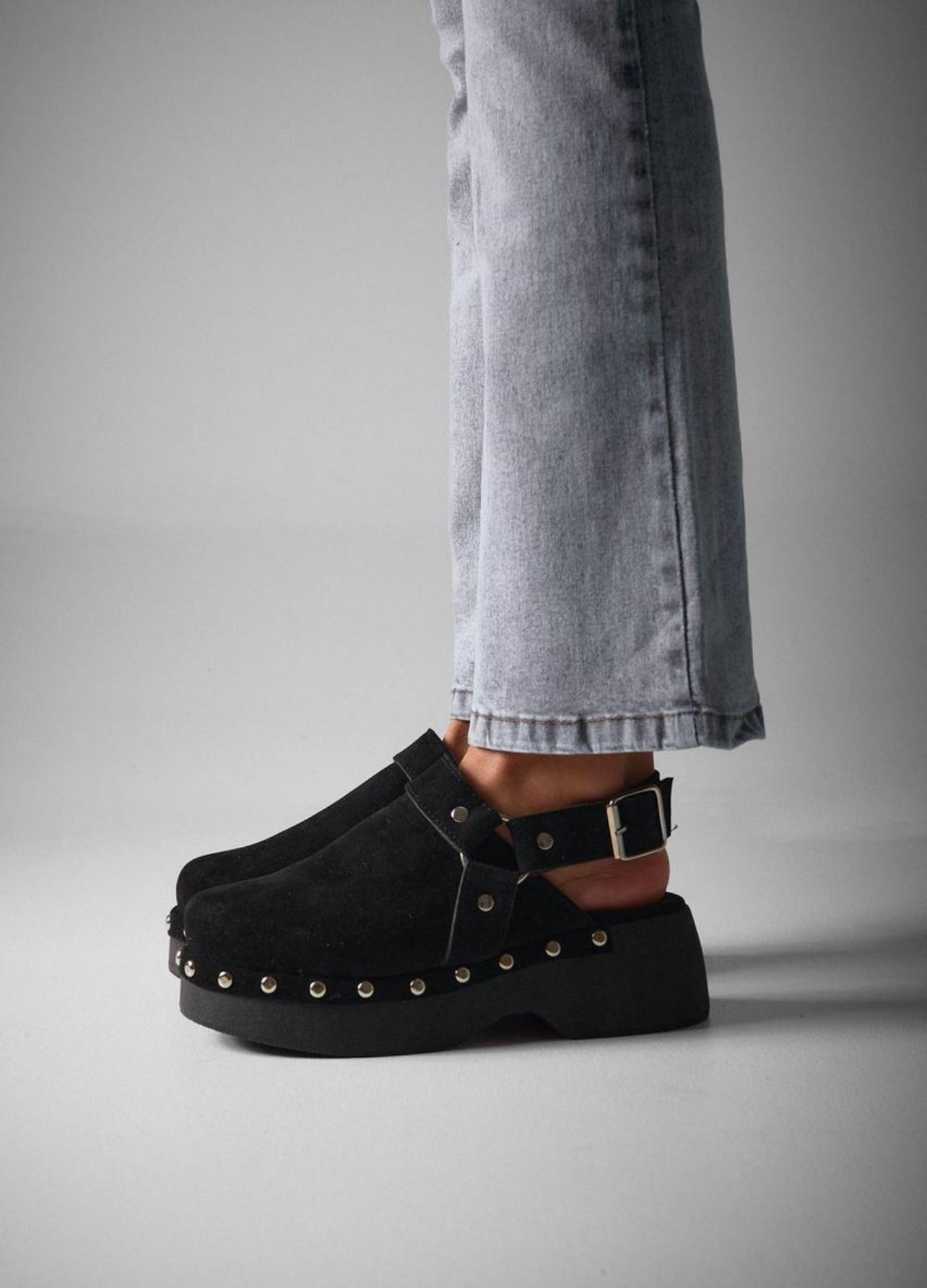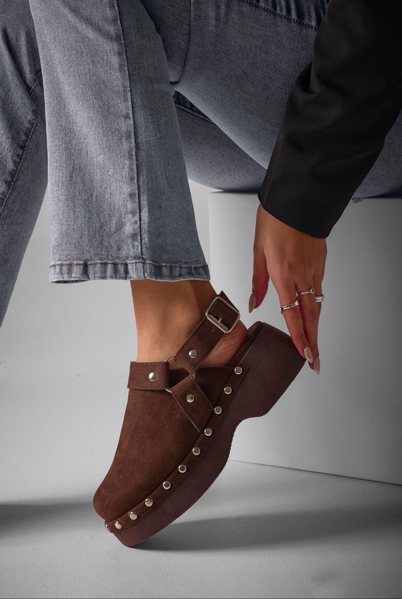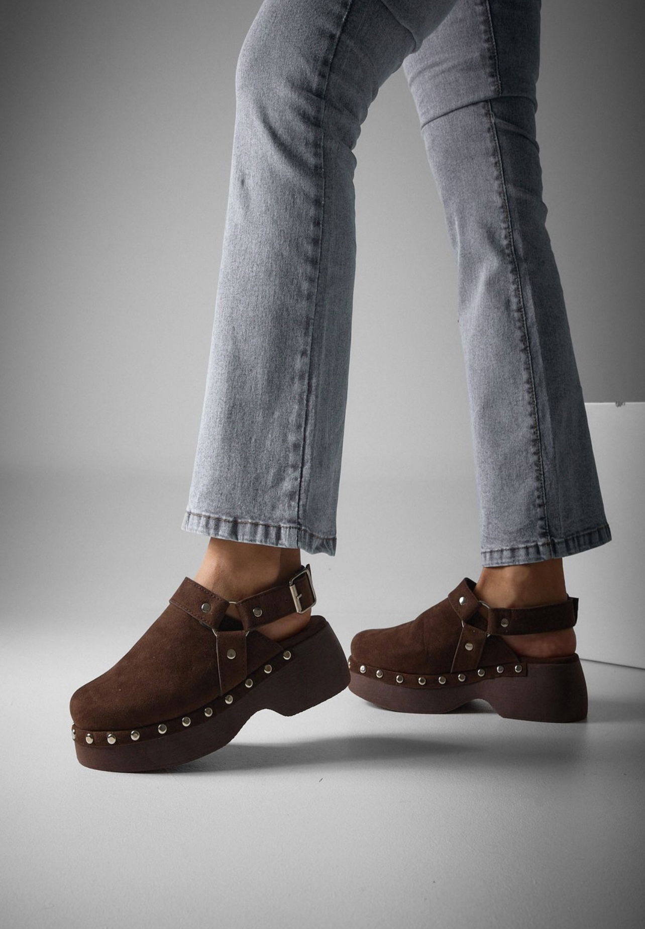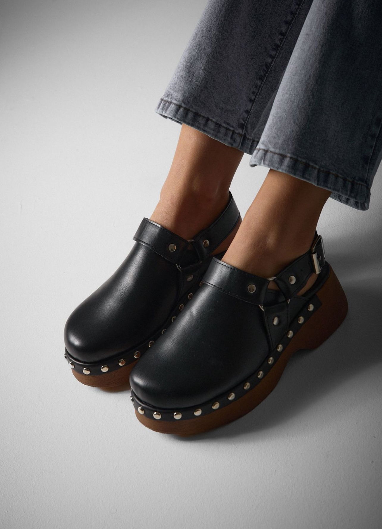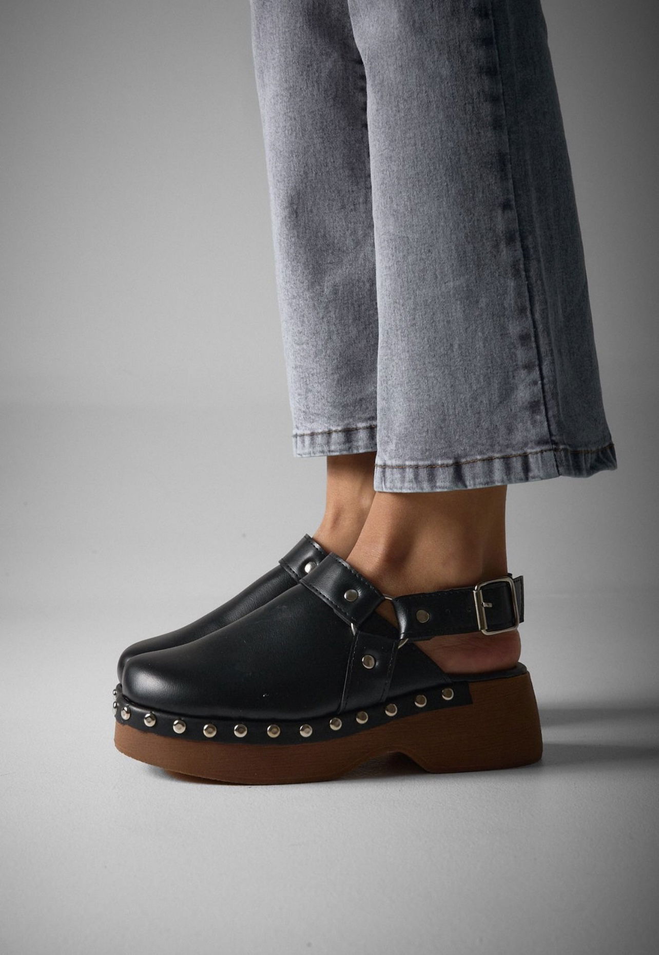 Zuecos con base liviana. Detalles en tachas. Pulsera con talonera.